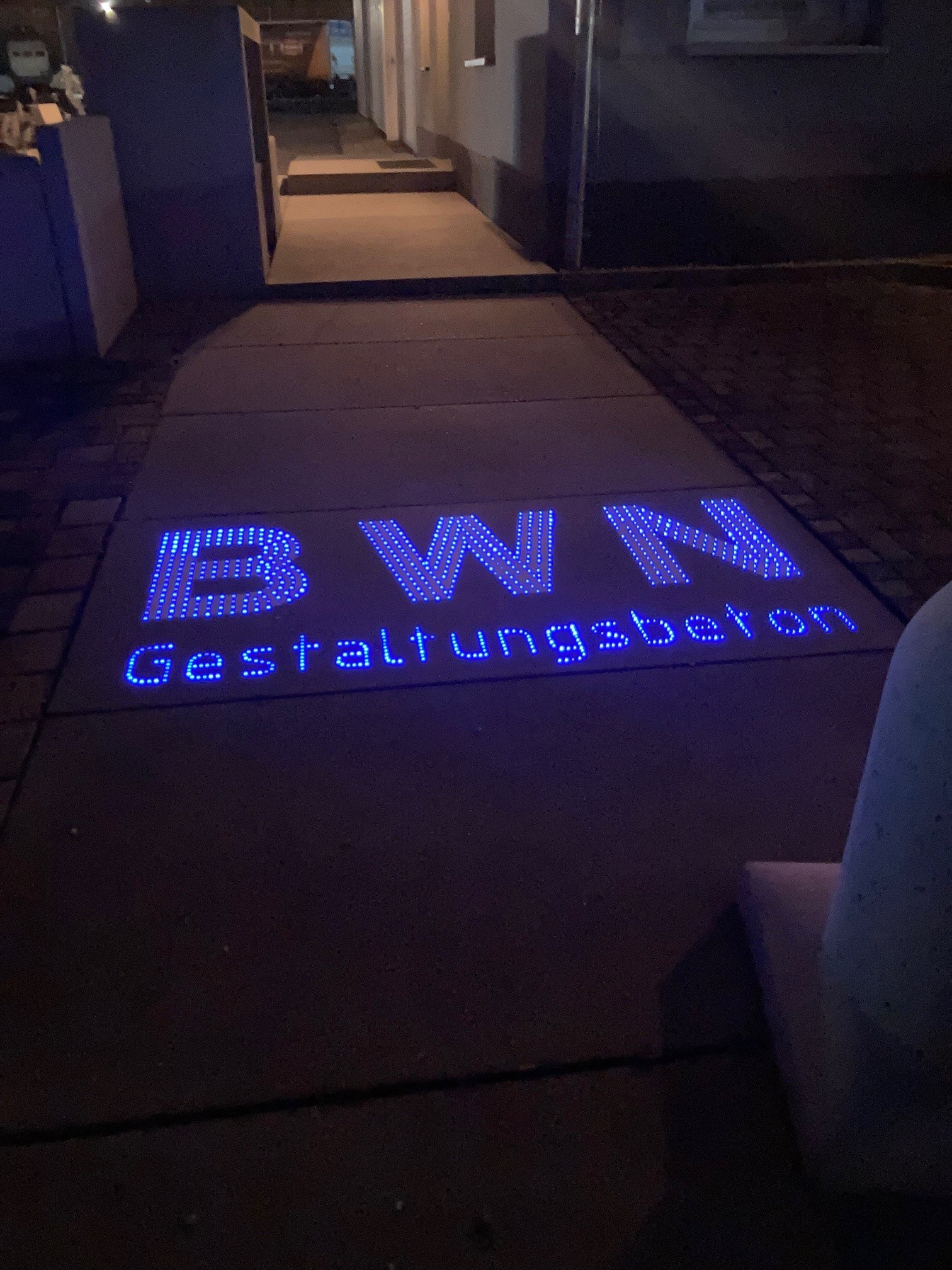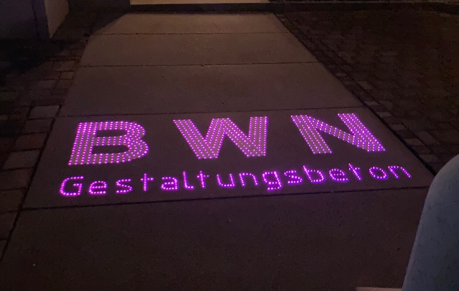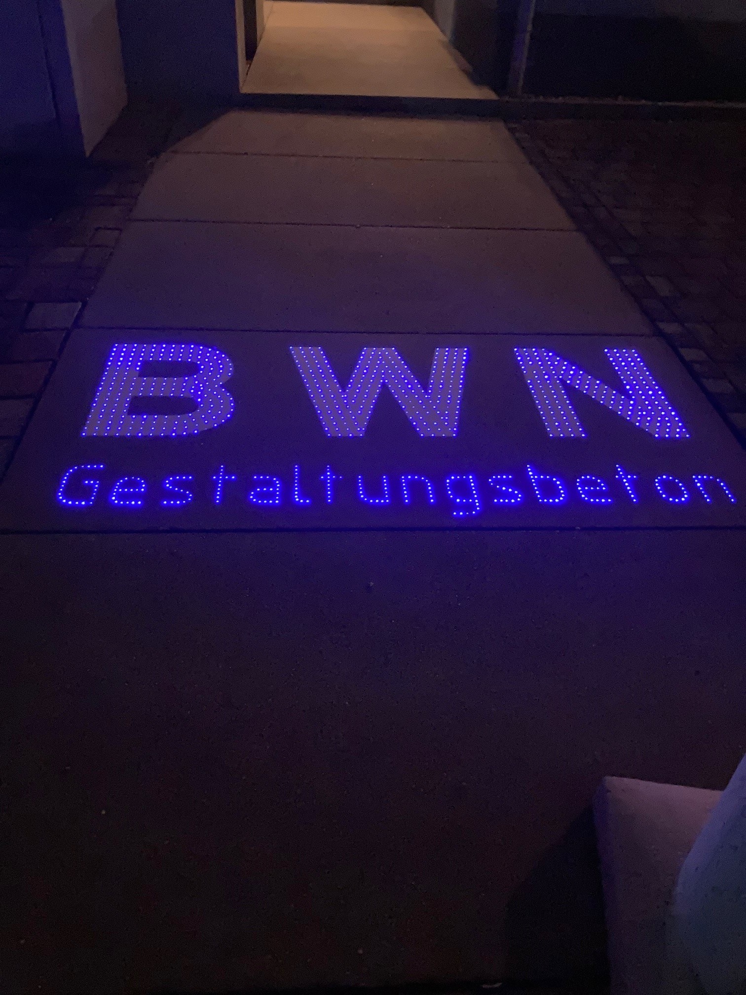 Es können die Fertigteile, zum Beispiel bei Logo´s mit verschiedenen farbigen Betonen für den Tag und mit Faserbeleuchtung für die Dunkelheit/Nacht hergestellt werden.