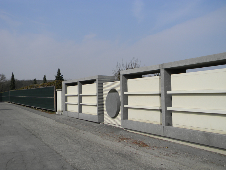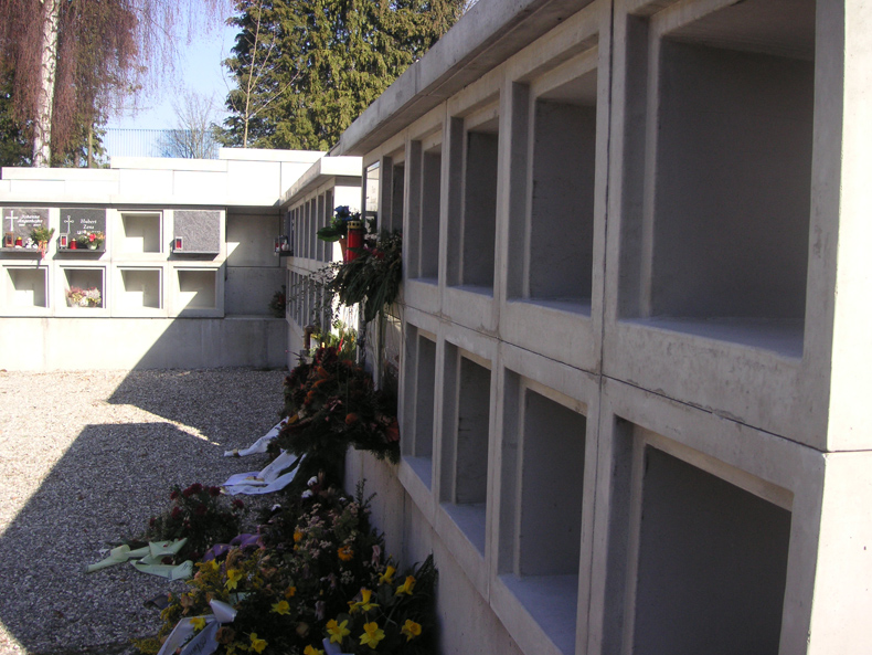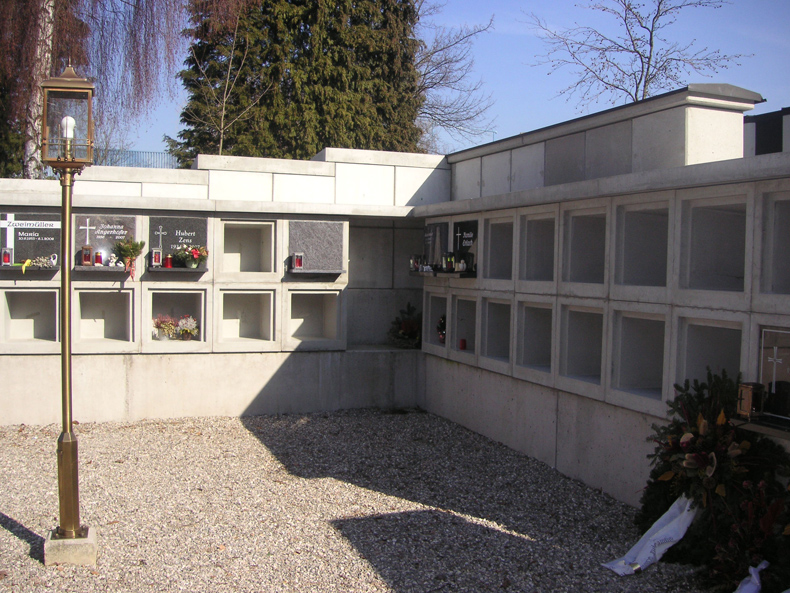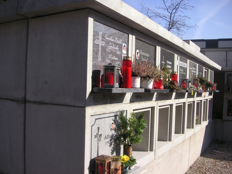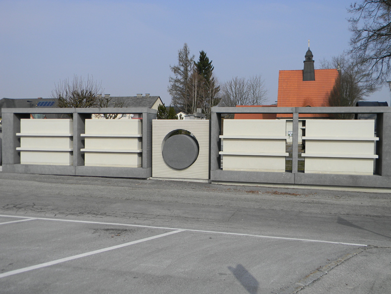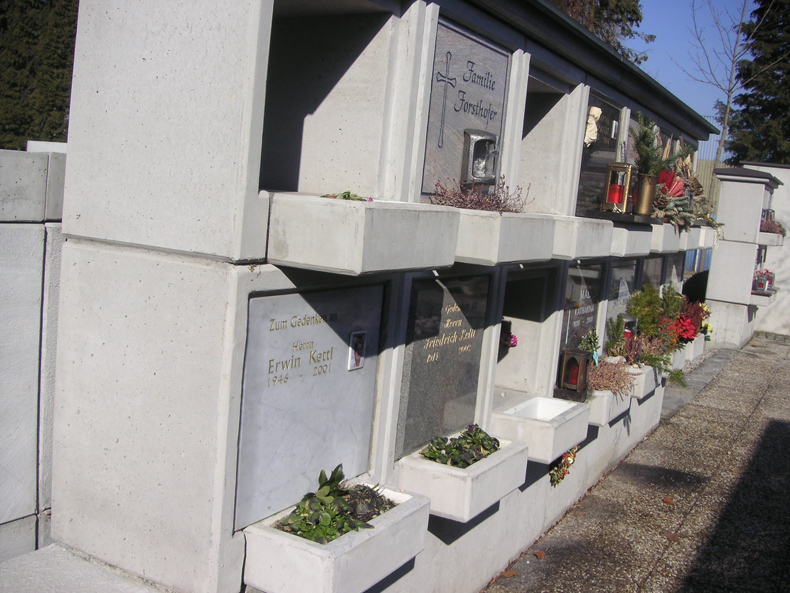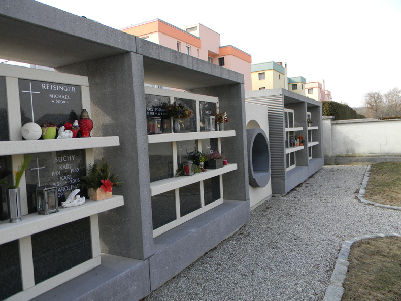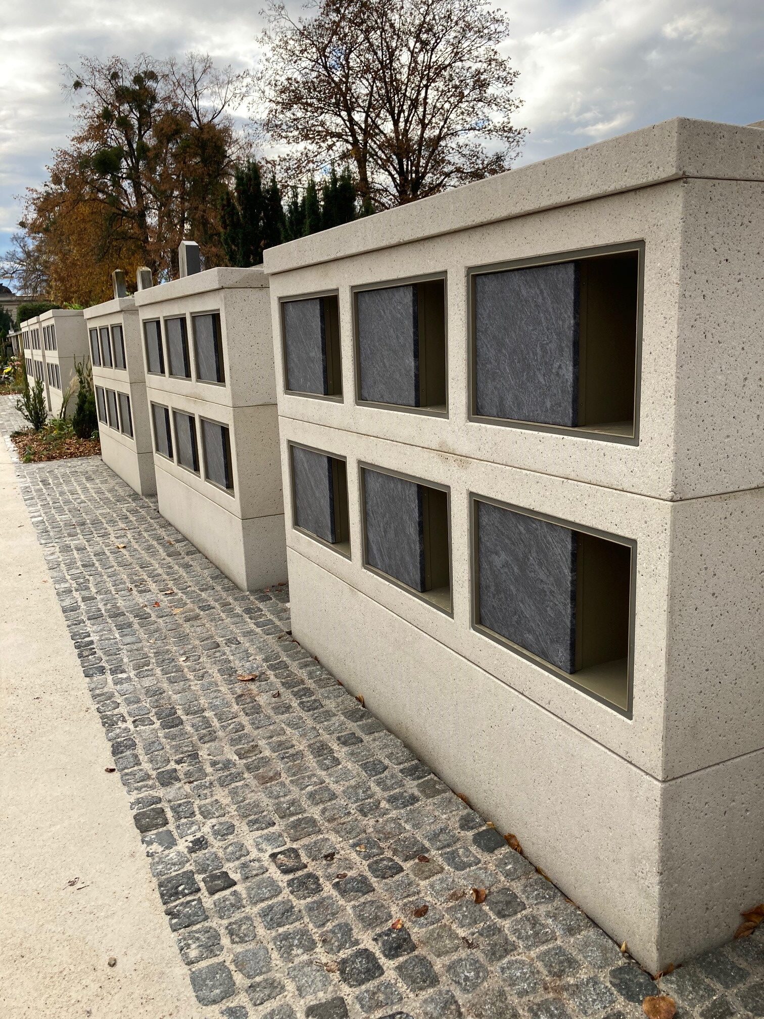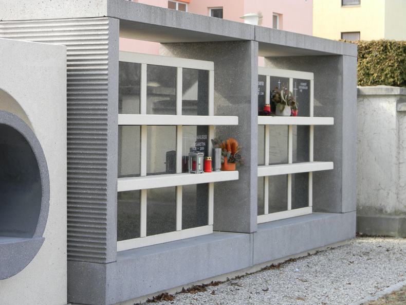 Urnenwände können in schlichter Ausführung mit Normalbeton in grau für die besinnliche Friedhofatmosphäre sorgen, oder aber mit einer aufgelockerten Planung, hergestellt aus Exclusivbeton mit Basalt und Travertinbeton, auch im Friedhof für gediegene aber dezent ansprechende Architektur sorgen.